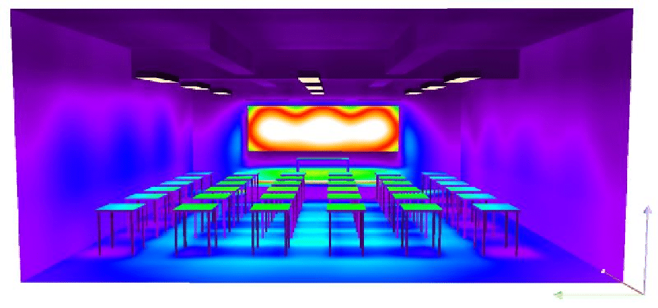 王朗說(shuō)道,“我們根據(jù)每個(gè)學(xué)校的勘測(cè)數(shù)據(jù)為每個(gè)教室建立3D模型,通過(guò)燈光模擬測(cè)算光環(huán)境數(shù)據(jù),以此為基礎(chǔ)設(shè)計(jì)燈具的安裝間距、安裝高度、投射角度等參數(shù),解決了投影儀位置影響黑板燈照明效果的問(wèn)題。在產(chǎn)品選型上,我們選擇了公司自研的SUNFLY護(hù)眼教室燈和SUNFLY可調(diào)角黑板燈,確保達(dá)到最佳照明效果?!?/span>